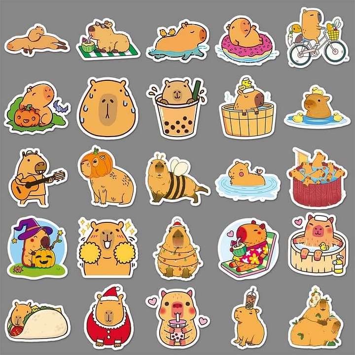 - Capybara sticker packs are commonly sold as multi-design sets and frequently emphasize waterproof durability for DIY, travel, and gear personalization. Examples include capybara sticker packs and waterproof designs from various shops, underscoring the product category and consumer interest. ([skippingpigeon.com](https://skippingpigeon.com/en-us/products/capybara-stickers?utm_source=openai))