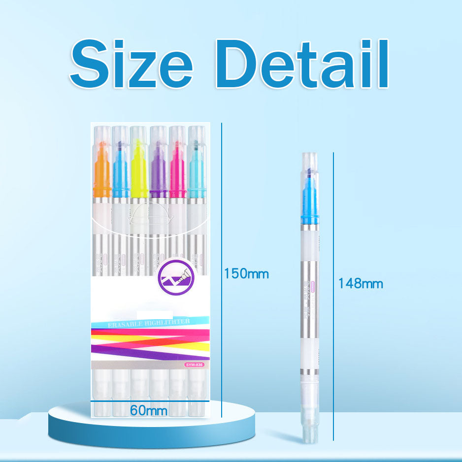 Stay neat with our erasable highlighters, featuring 6 vibrant colors in each pack. These dual-tip pens offer a highlighter on one end and an eraser on the other, allowing you to easily remove markings with just a swipe. Watch any mistakes disappear in 3 seconds, making them perfect for studying, note-taking, or organizing.