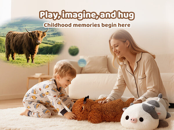 • Easy Washing - Machine washed on the delicate cycle mode or hand washing are all optional. Dry them in a well-ventilated area or tumble-drying with the machine. Remember to fluff up the large weighted stuffed animal fully to enjoy the weighted highland cow plush well.