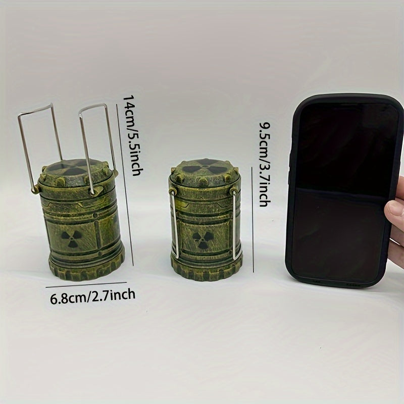 Equipped with two rugged handles reminiscent of a camping lantern, this light can be lifted to reveal its glowing green core. When extended, it serves as an ambient night light, casting an eerie yet captivating glow, perfect for sci-fi enthusiasts and industrial décor lovers alike.